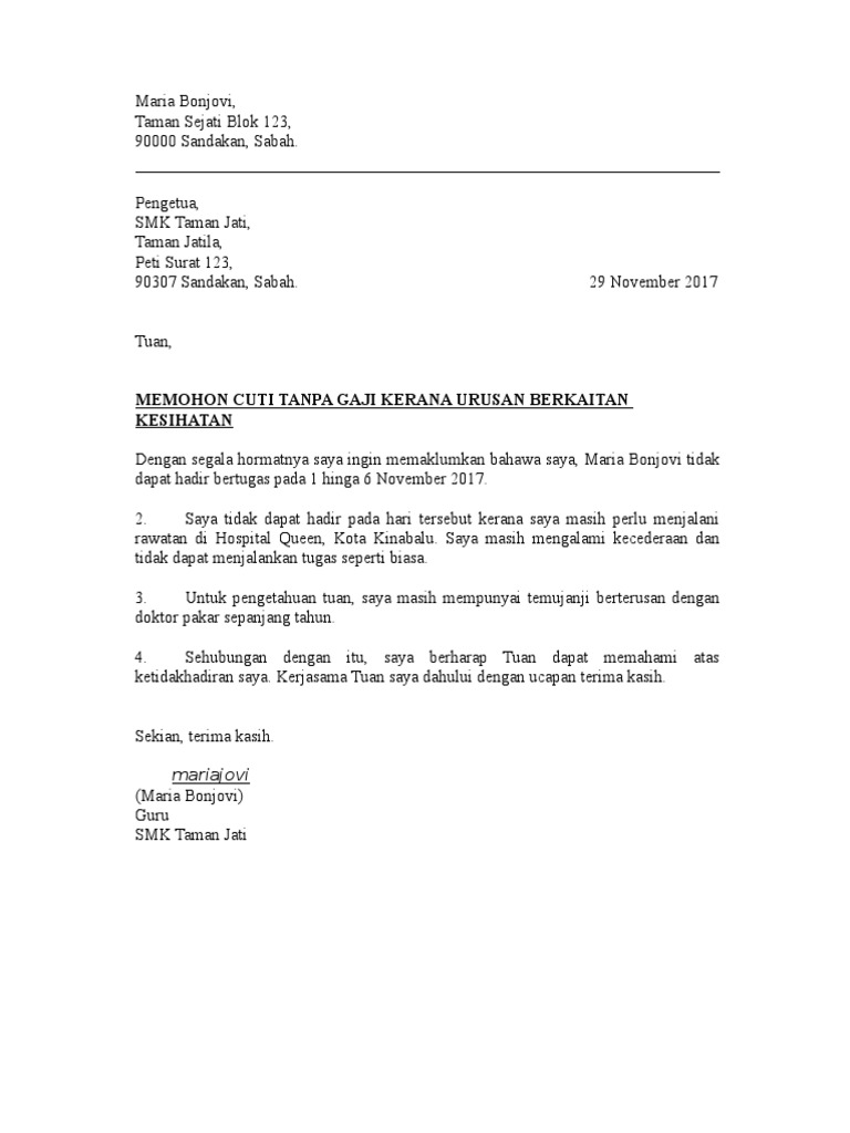 Contoh surat rasmi cuti tanpa gaji have a graphic associated with the other contoh surat rasmi cuti tanpa gaji in addition it will feature a picture of a sort that may be seen in the gallery of contoh surat rasmi cuti tanpa gaji. Dalam contoh nama pekerja alamat pekerja tarikh. Mendapat sokongan ketua jabatan 4. We have 13 images about surat cuti tanpa gaji guru including images pictures photos wallpapers and more.