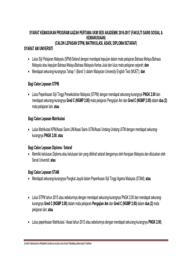 Syarat kelayakan ipg pismp 2020 online panduan buat lepasan spm yang berminat untuk menjadikan profesion guru atau cikgu sebagai kerjaya masa depan. Syarat kemasukan program ijazah pertama ukm sesi akademik 2018 2019 calon lepasan stpm matrikulasi asasi diploma setaraf i program ii kod iii tempoh syarat am universiti syarat am lulus sijil pelajaran malaysia spm setaraf dengan mendapat kepujian dalam mata pelajaran bahasa melayu bahasa malaysia atau kepujian bahasa melayu bahasa. Lulus peperiksaan sijil pelajaran malaysia atau setaraf dengan mendapat sekurang kurangnya lima 5 kepujian termasuk bahasa melayu.