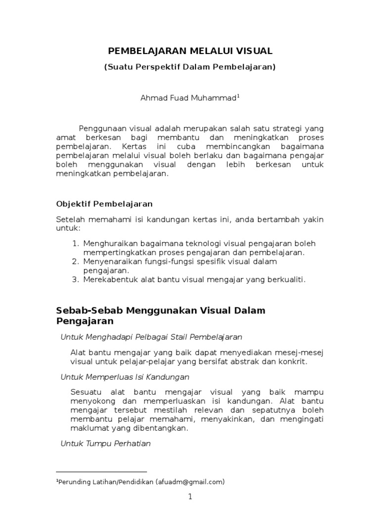 Visual untuk pengajaran dan pembelajaran. Bagaimana prinsip pemilihan media visual dalam pembelajaran 3. Menyatakan peranan visual dalam pengajaran 3. Buku ini dianggap penting kerana meliputi kesemua tajuk. 3 teknik pembelajaran visual untuk mendukung perkembangan karier dan bisnis agar sukses dalam kehidupan karier dan bisnis dibutuhkan pengetahuan yang harus senantiasa dipelajari.